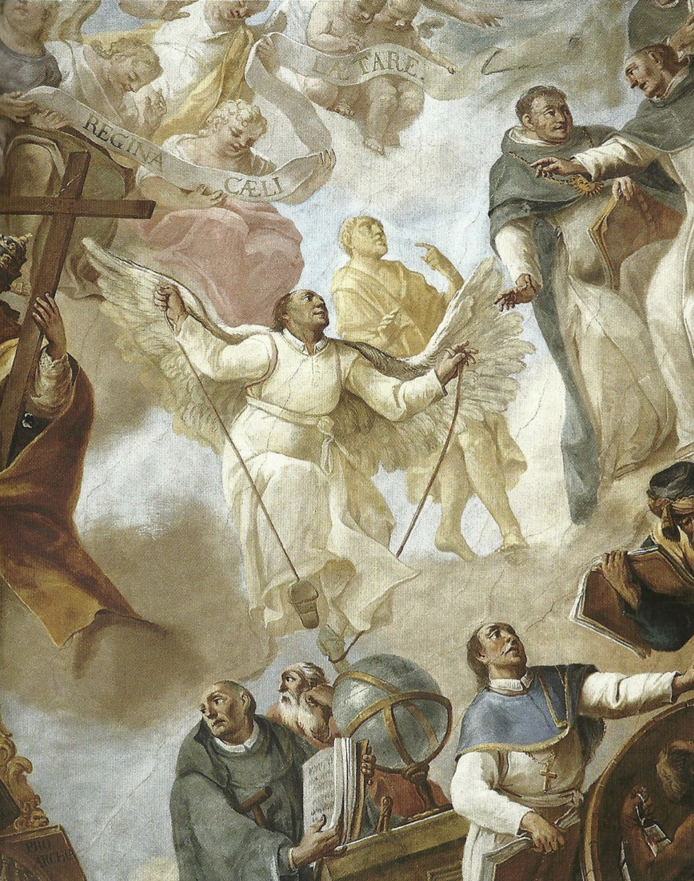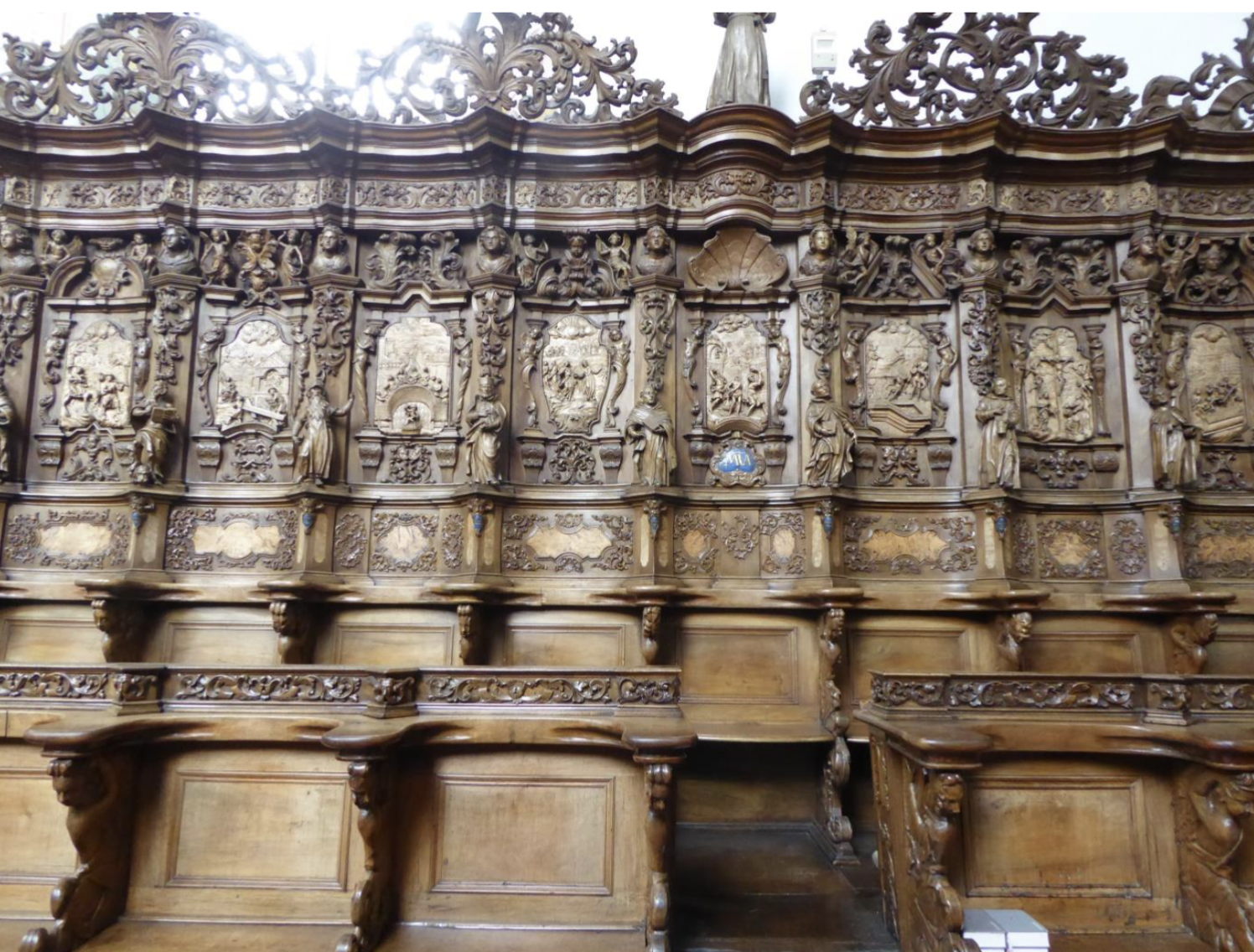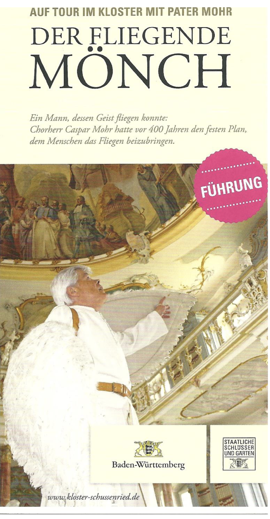 Schnell war Bad Schussenried erreicht. Der trübe Nachmittag ließ nur wenige Besucher zu der alten, schönen Klosteranlage kommen. Am Büchershop im ehemaligen Konventsgebäude erkundigen wir uns gleich nach Wilfried Buck, der als fliegender Pater dort wohlbekannt ist und wir konnten ihn telefonisch erreichen. Da er noch seinen Enkel zu betreuen hatte, verabredeten wir uns um 17 Uhr in der Bibliothek, jenem prachtvoll ausgestalteten Saal, in dessen Deckenfresko der berühmte, fliegende P. Mohr (1575-1625) dargestellt ist, den Wilfried im mer wieder mimt. Somit blieb uns noch etwas Zeit, die großartige, dem heiligen Magnus geweihte Klosterkirche, die heute als Stadtpfarrkirche dient, zu besichtigen. Hier ist besonders das künstlerisch wertvolle Chorgestühl zu bestaunen. Glücklicherweise war eine ältere Dame als Aufsicht in dem Gotteshaus; sie konnte uns unsere neugierigen Fragen kompetent beantworten und zeigte uns sogar die Sakristei mit Nebenräumen, die sonstigen Besuchern verschlossen bleiben.