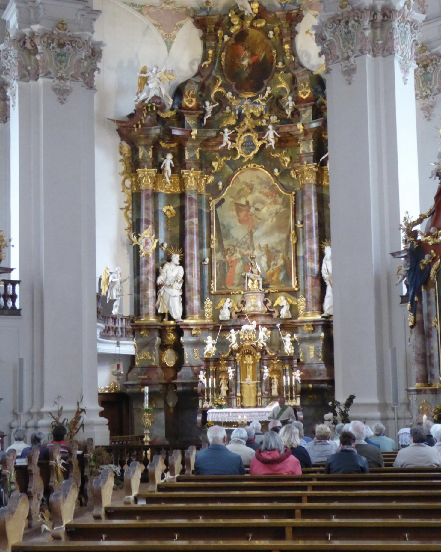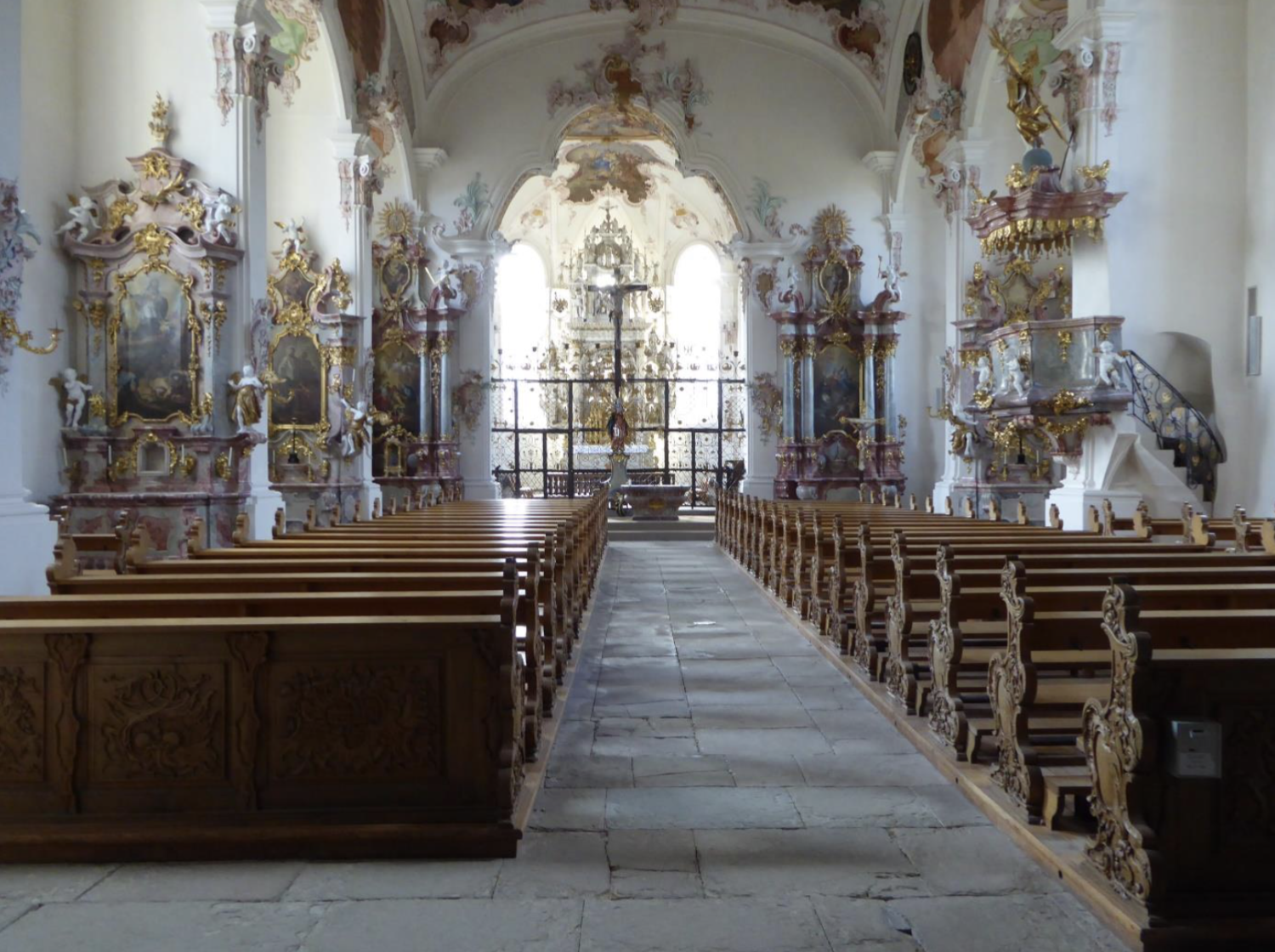 Da kommt man schon ins Grübeln und Sinnieren. Ich fuhr die paar Schritte weiter in Richtung Unterstadt zum Parkplatz vor dem ehemaligen Atombunker unter der Schlosskirche und ging den steilen, etwas verwilderten Weg hinauf zum Gotteshaus. Bei unserem letzten Besuch vor zwei Jahren war die Kirche wegen Restaurierungs- und Sanierungsarbeiten geschlossen gewesen. Umso mehr erfreut war ich, dass ich nun das grandiose, barocke Gotteshaus in frischem Glanz erleben konnte. Ich trat durch die alte, rückwärtige Tür und erblickte auf dem historischen Steinfußboden gleich ein Warnschild „Achtung Stolperfalle“. Das war berechtigt denn die alten Sandstein-Bodenplatten waren echt gefährlich. Dies tat aber der Großartigkeit dieses Gotteshauses keinen Abbruch: Kirchenbänke mit wunderschön geschnitzten Wangen, zahlreiche Seitenaltäre mit fantasievollen Altarbildern, brillante Decken- und Gewölbefresken, ein grandios geschmiedetes Chorgitter, davor die schmerzhafte Muttergottes unter einem lebensgroßen Kruzifixus, dahinter im großzügigen Chorraum ein Altaraufbau im Renais- sancestil und überall liebliche Putten und Engel, die einem den Eindruck vermitteln, man sei wirklich im Himmel. So hatten es auch die Barockmeister beabsichtigt und wahrlich, es ist ihnen gelungen. Ja, hier hatten wir damals vor mehr als einem halben Jahrhundert als Schüler oft unter der Leitung unseres Musikuses P. Schröter gesungen und an verschiedenen Feierlichkeiten teilgenommen.