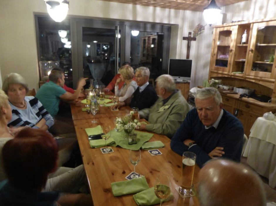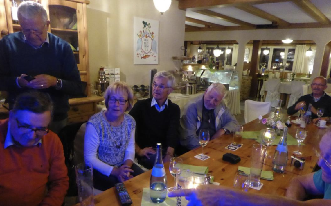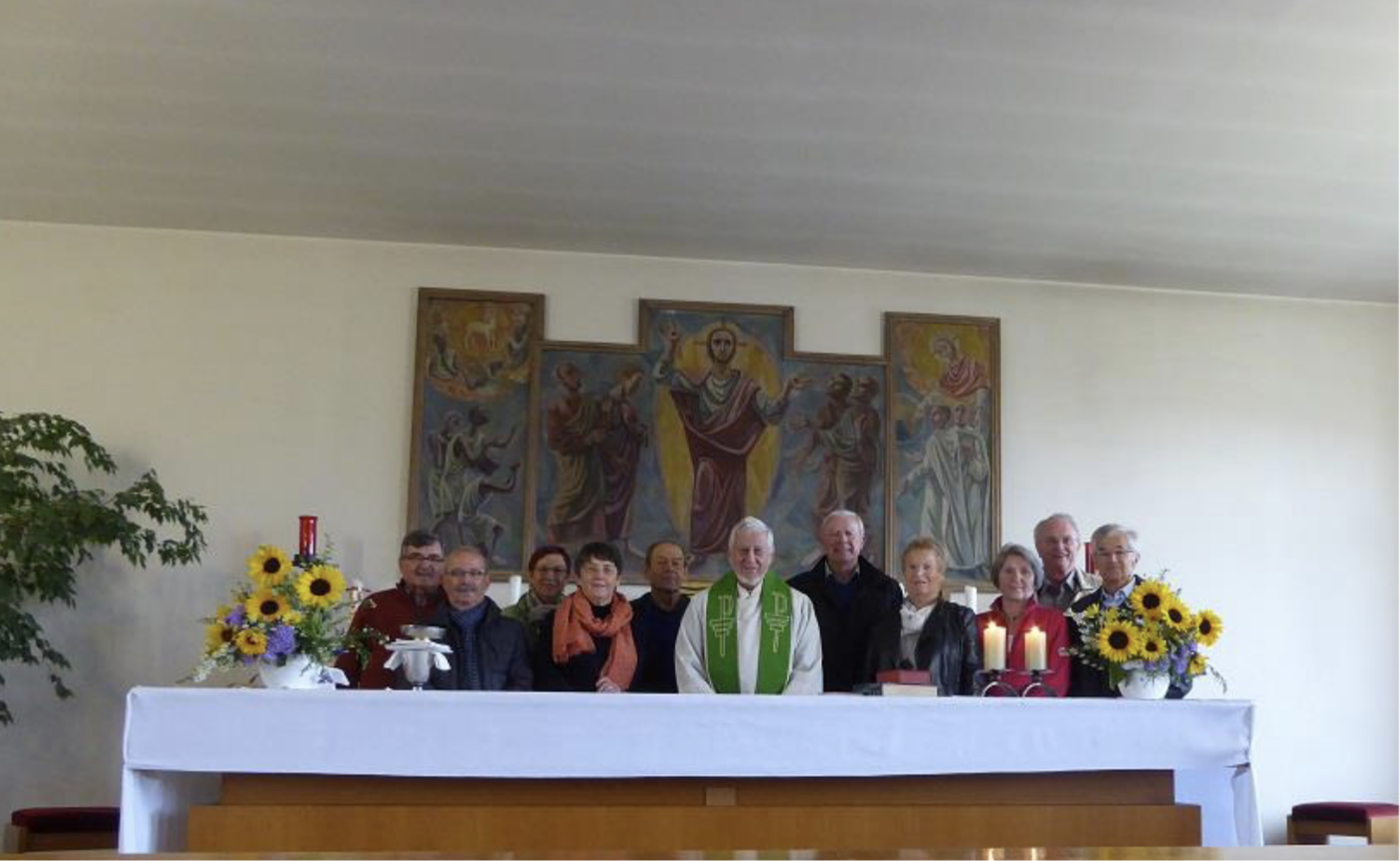 Ein schöner, harmonischer Abend in trauter Runde hat sich entwickelt, alte Erinnerungen wurden aufgefrischt. Man sprach über Kinder und Enkel, über dies und das und so wurde es rasch spät und der Gasthof leerte sich, sodass wir alle müde und erschöpft die Liegestätten aufsuchten. Freilich, Albert musste noch zurück ins Missionshaus, was er auch in einer halben Stunde locker geschafft hat. Am nächsten Morgen war für 9.30 Uhr ein Gottesdienst mit Albert in der Kapelle des Missionshauses vorgesehen. Selbstverständlich, wie konnte es anders sein, sangen wir nach alter Tradition Gregorianischen Choral und zwar die VIII. Messe und das III. Credo. Erstaunlich, wie gut das noch geklappt hat, vor allem weil Albert noch einige alte Exemplare des Liber usualis zusammengesucht hatte. Ein besonderer Höhepunkt war dann, als Albert das Vaterunser in einer afrikanischen Sprache sang, in der er jahrelang als Missionar in Westafrika ge- sprochen hatte. Um den Altar versammelt empfingen wir die Kommunion in Gestalt von Brot und Wein. Ja, wir haben doch noch irgendwelche Gemeinsamkeiten, die uns einen und ver- binden. Und am Ende kam wieder wie beim letzten Mal vor zwei Jahren um den Altar stehend das Gruppenfoto